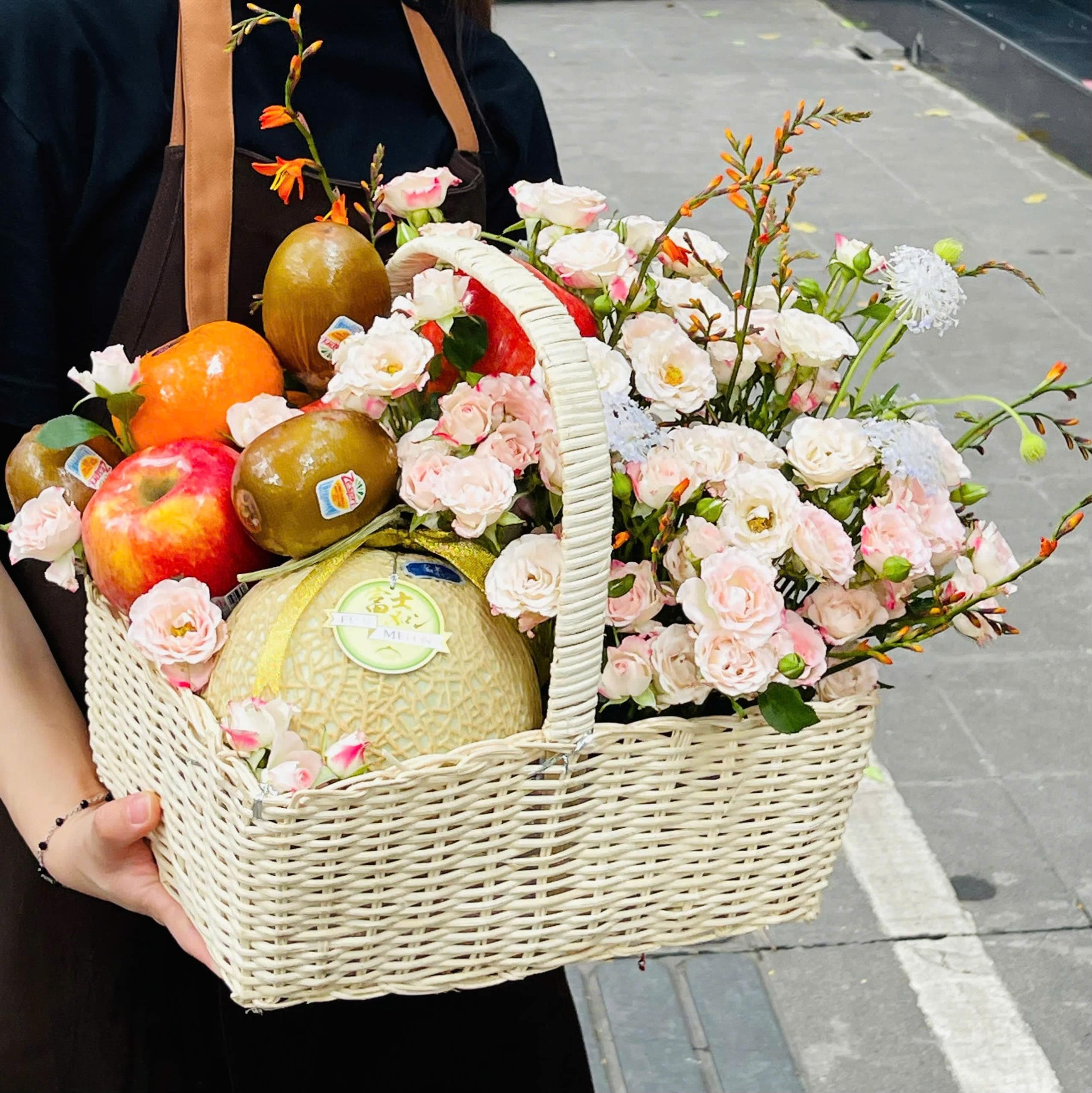 “Giỏ hoa quả biếu tặng tinh tế với táo Envy Mỹ size 24 ngọt giòn, quýt Úc thơm mát, kiwi vàng bổ dưỡng, dưa Melon Nhật ngọt ngào, cùng một chút sắc hoa tươi xinh xắn – món quà hoàn hảo cho những người yêu thương. 🍏🍊🥝🍈🌸”