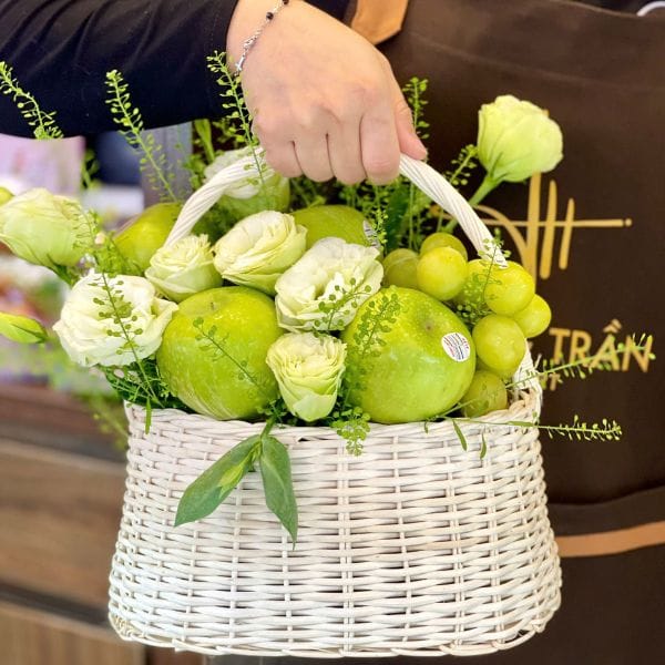 Giỏ quà xanh mát, đầy sức sống với nho xanh giòn Úc, táo chua xanh tươi ngon và hoa tươi thắm – một món quà ngọt ngào dành tặng người thân yêu. 💚🍇🍏🌸 #GiỏQuàTươiMới #MónQuàTừTìnhYêu #SứcSốngMới”