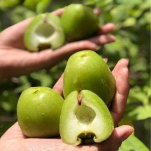 – Trái roi nhỏ, vỏ trái màu xanh ngọc bích, có đốm hồng trên cuống, và thường có vết sứt nhẹ (càng sứt nhiều, vị càng ngọt thơm).